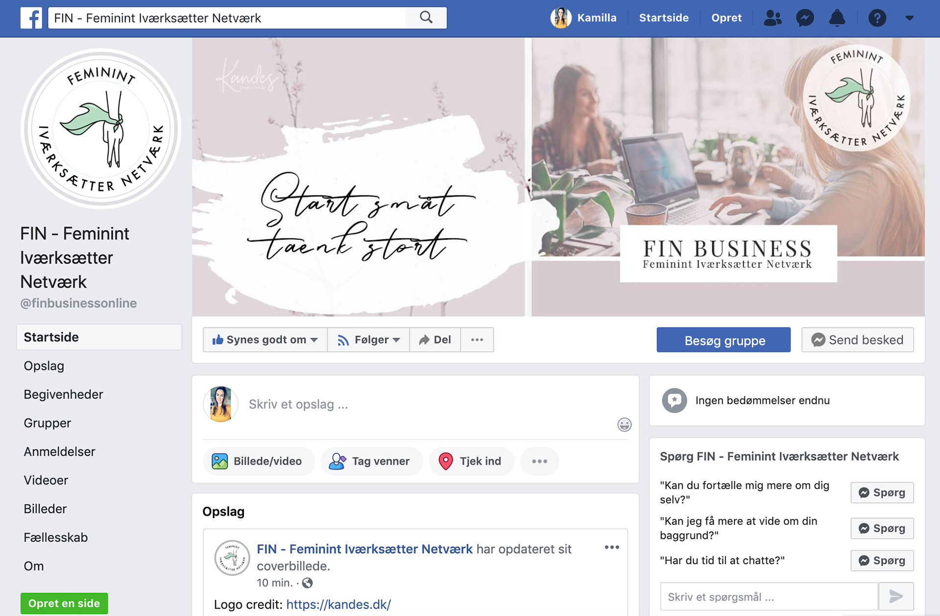 Nyt coverbillede som viser netværksgruppen FIN's værdier på deres medlems gruppe på Facebook. Start småt - tænk stort 🌸