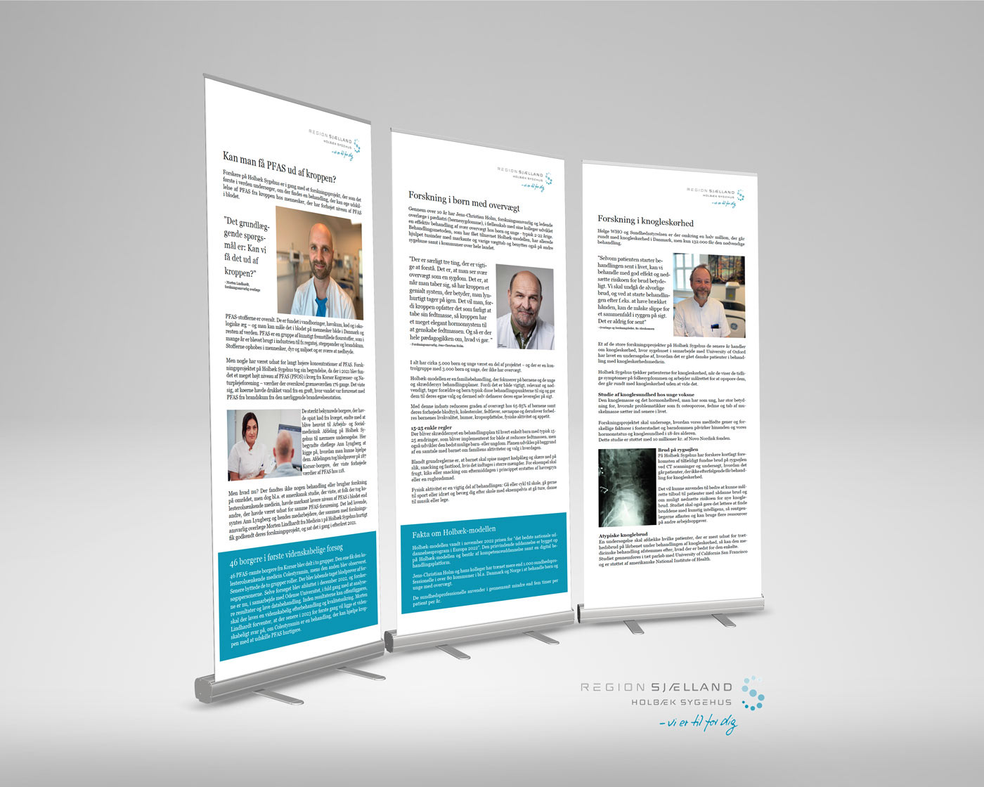 Design af rollups til Holbæk sygehus 2 år i træk. Layout overholder Region Sjællands design guidelines så al deres markedsførings materiale er ensartet.